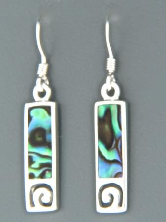 These Sterling Silver drop style earrings feature inlaid New Zealand Paua Shell with a spiral design.
