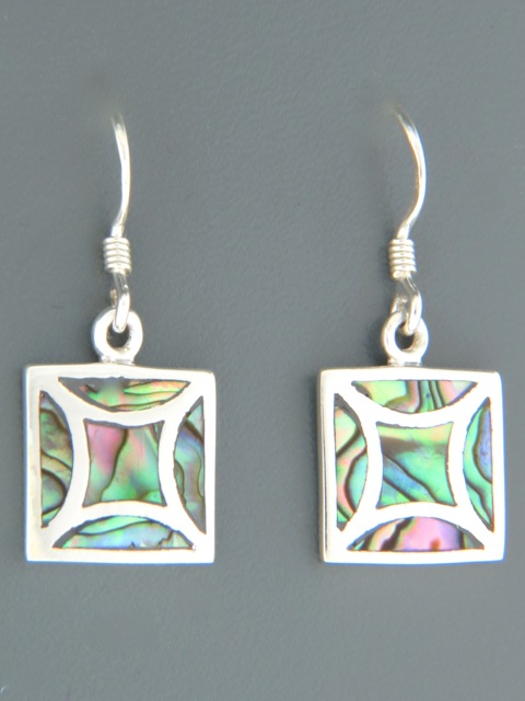 These Sterling Silver drop style earrings feature inlaid New Zealand Paua Shell in a square shaped mosaic.