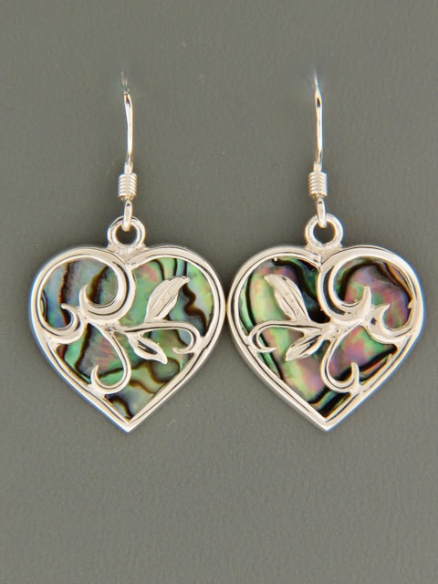 These Sterling Silver drop style earrings feature New Zealand Paua Shell in a heart design. These earrings are open at the back to show just polished Paua Shell.