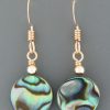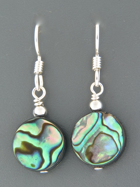 These Sterling Silver drop style earrings feature round, double sided, flat New Zealand Paua Shell beads.