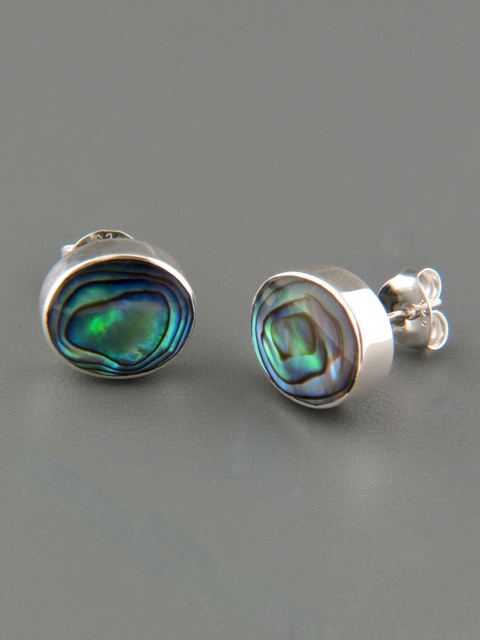 These Sterling Silver stud style earrings feature inlaid, oval shaped New Zealand Paua Shell.