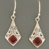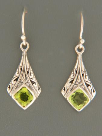 These filigreed Sterling Silver drop style earrings feature square shaped, faceted Peridot stones.