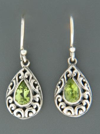 These Sterling Silver drop style earrings feature teardrop faceted Peridot stones.