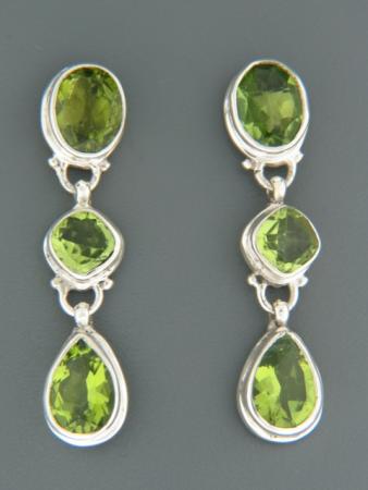 These Sterling Silver drop style stud earrings feature oval, square and teardrop faceted Peridot stones.