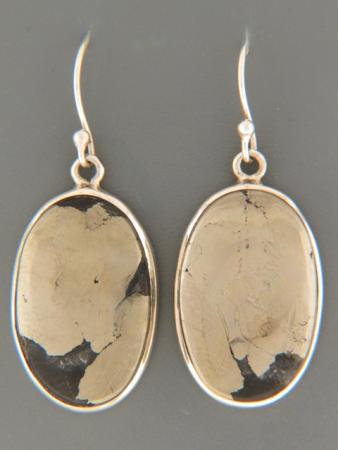 These Sterling Silver drop-style earrings feature oval-shaped Pyrite cabochons.