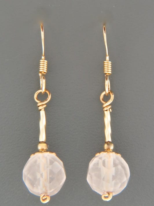 A drop style earring featuring round faceted Rose Quartz stones with Gold beads.