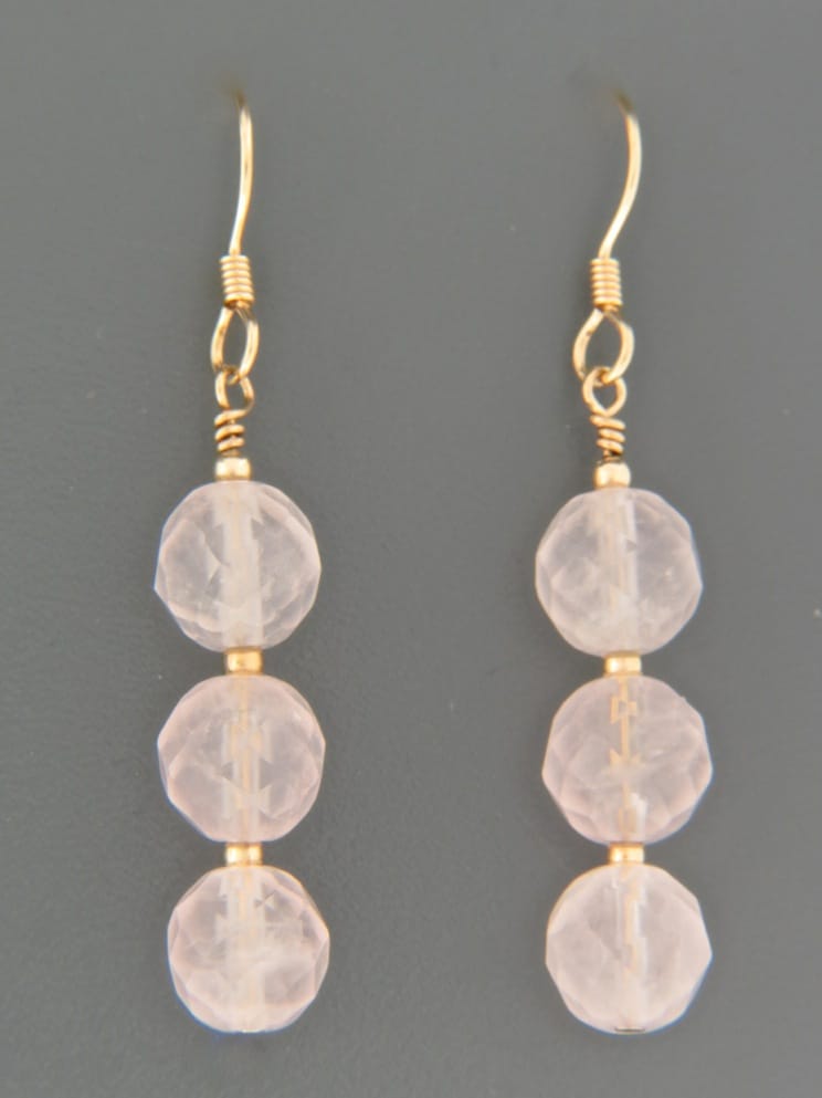 A drop style earring featuring round faceted Rose Quartz stones with gold beads.