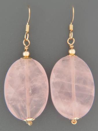 A drop style earring featuring oval faceted Rose Quartz stones with gold beads.