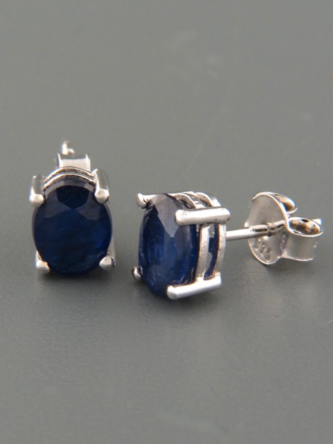 These Sterling Silver stud style earrings feature faceted, oval shaped Blue Sapphire stones.