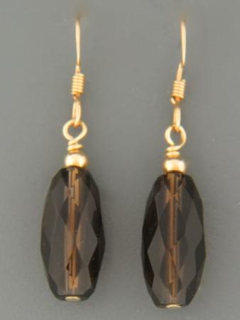 A drop style earring featuring oval faceted Smokey Quartz stones with gold beads.