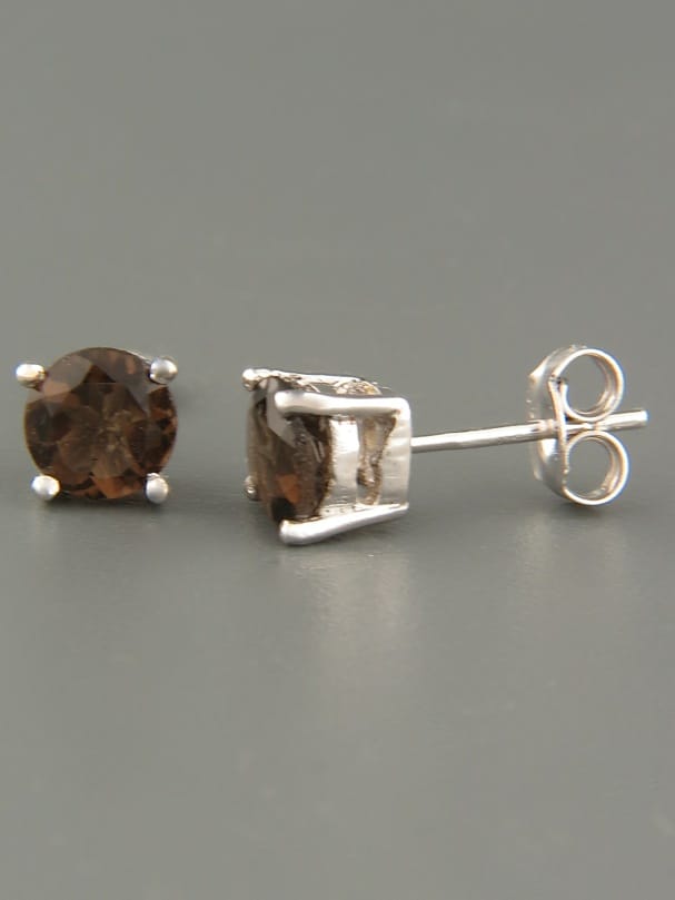 These Sterling Silver stud style earrings features round faceted Smokey Quartz stones.