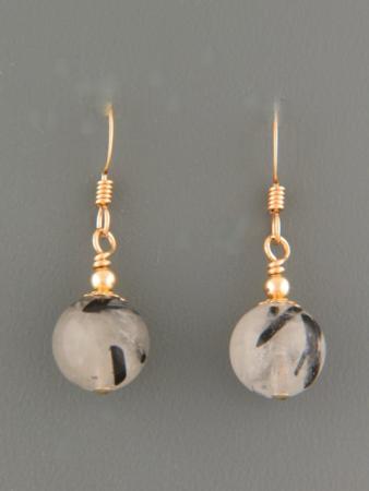 These Gold drop style earrings feature round Tourmalinated Quartz stone beads.
