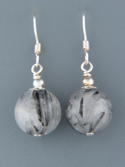 These drop style earrings feature round Tourmalinated Quartz stones with Sterling Silver fittings.