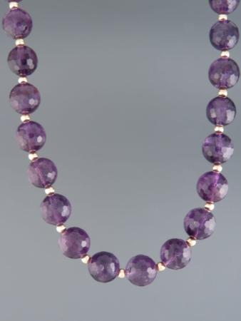 A necklace featuring round faceted Amethyst stones with gold beads.