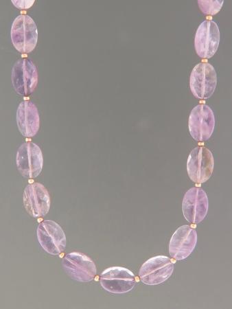 A necklace featuring oval faceted Amethyst stones with gold beads.