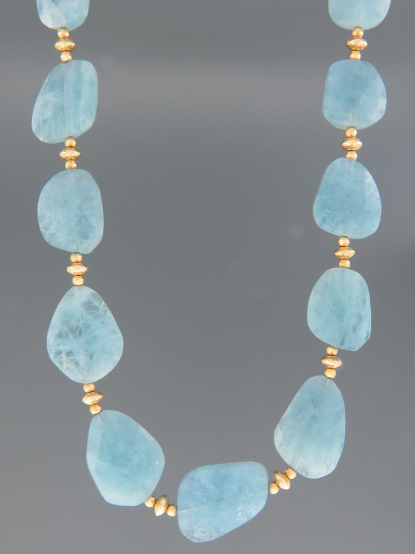A necklace featuring graduated, hand faceted Aquamarine stones with gold beads.
