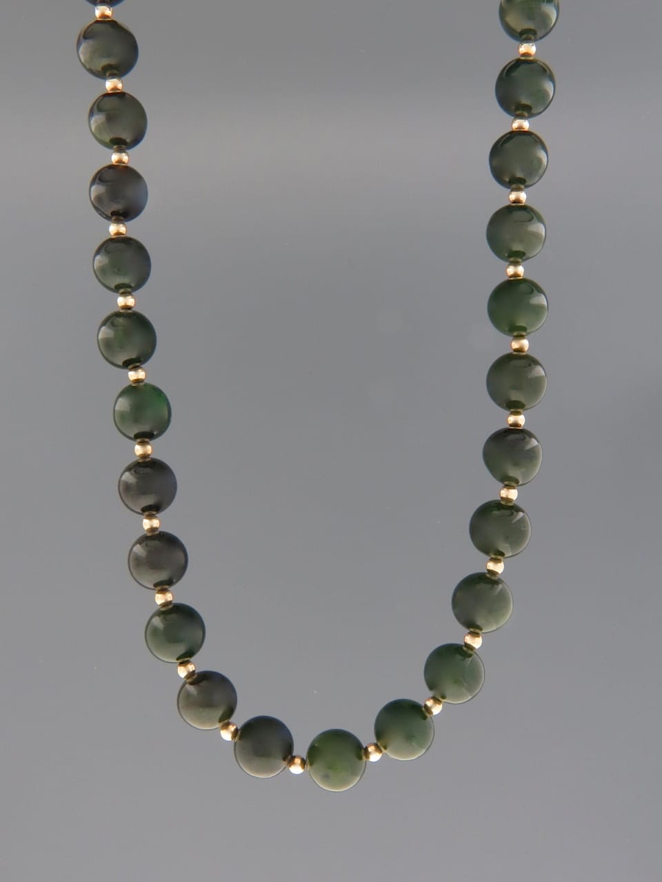 This necklace features round, smooth polished Jade stones with 3mm round gold beads.