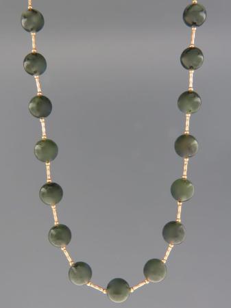 This necklace features round Jade stones with gold twist beads.