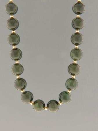 This necklace features round, smooth polished Jade stones with 3mm round gold beads.