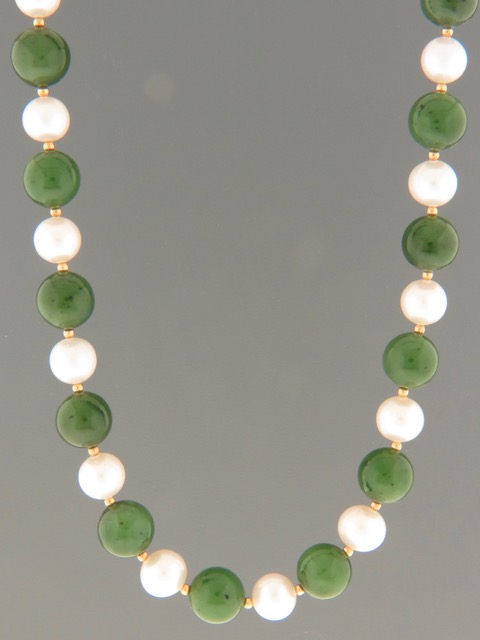 This necklace features round Jade stones and White Pacific Pearls with gold beads.