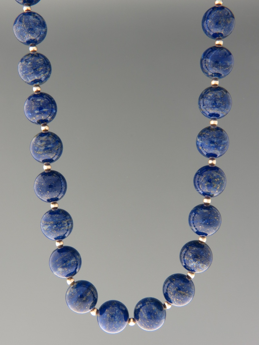 This necklace features round Lapis Lazuli stones with 3mm round Gold beads.