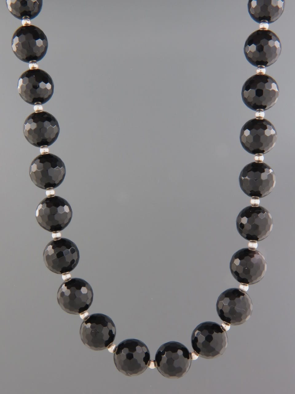 A necklace featuring round, faceted Onyx stones with 3mm round Sterling Silver beads.
