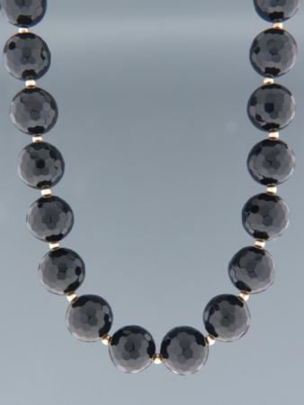 This necklace features round, faceted Onyx stone beads with Gold beads.