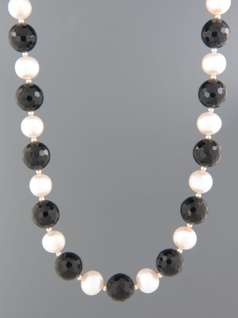 Onyx & Pearl Necklace – 10mm round faceted stones – OX084