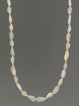 This necklace features hand-cut graduated Ethiopian Welo White Opal beads showing vibrant green, blue, gold, pink and orange colours with 2mm round Gold beads.