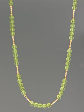 A necklace featuring round faceted Peridot stones with gold beads.