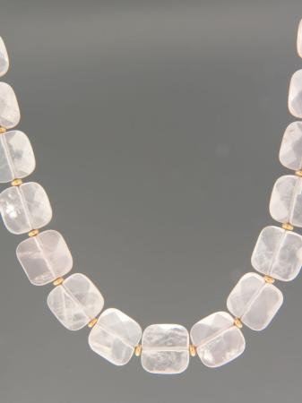 A necklace of square faceted Rose Quartz stones with Gold beads and Parrot clasp.