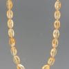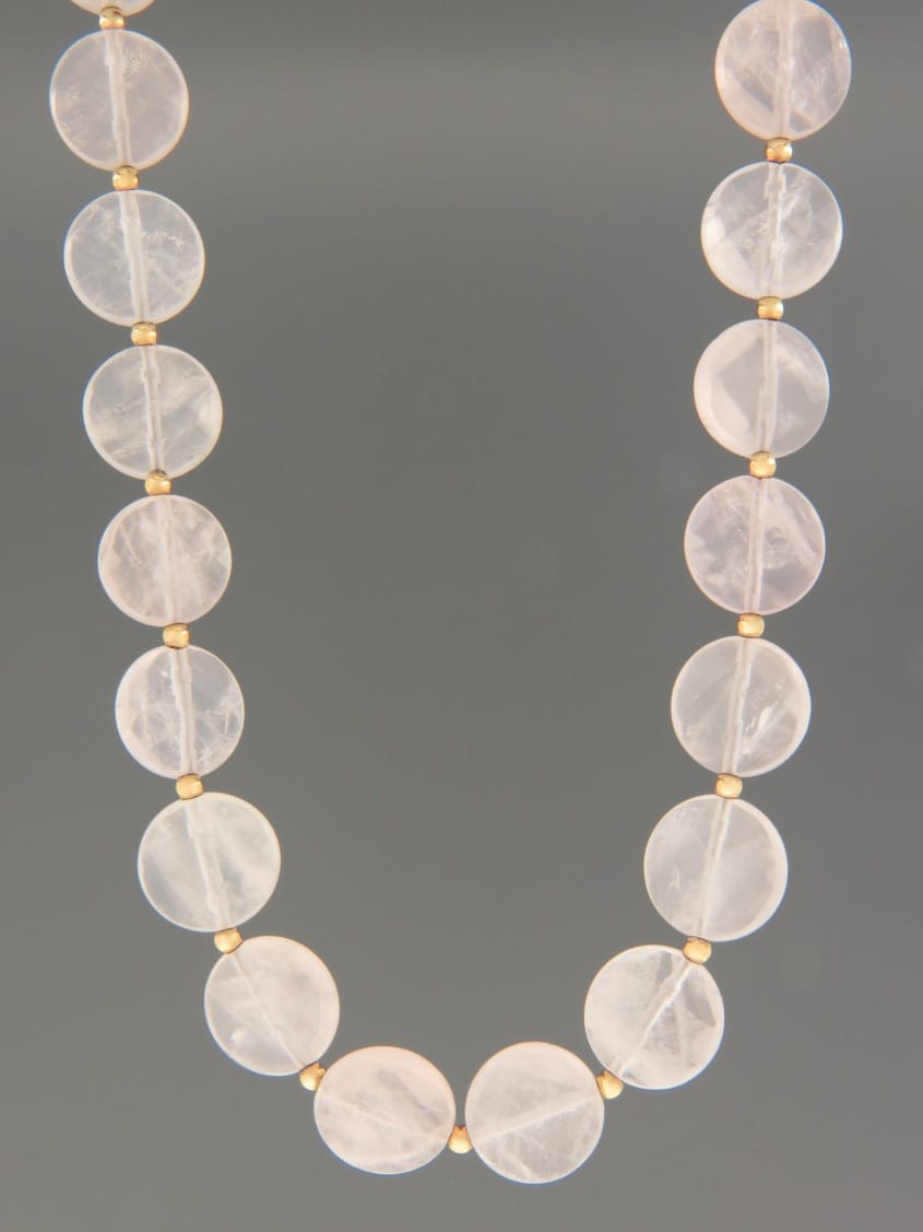 A necklace of round faceted Rose Quartz stones with gold beads.