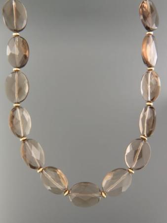 A necklace featuring oval faceted Smokey Quartz stones with gold beads.