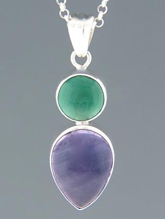 This Sterling Silver pendant features a round Malachite cabochon and a teardrop Amethyst cabochon.
