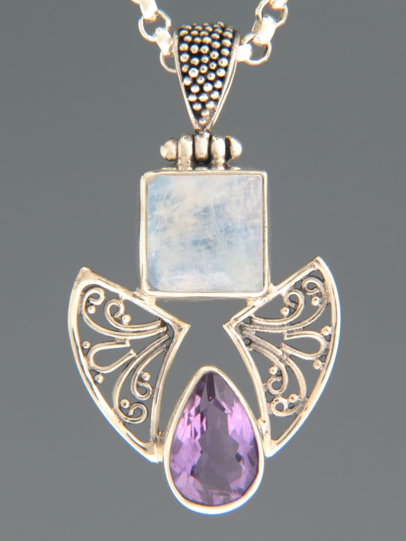 This Sterling Silver pendant features a faceted teardrop Amethyst stone with a square Blue Moonstone cabochon.