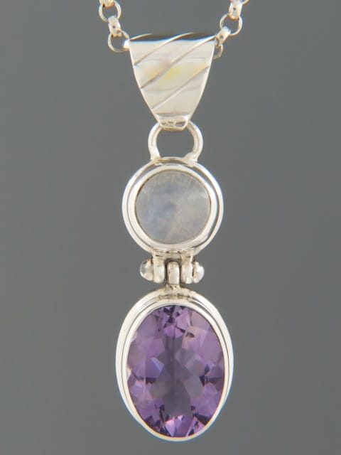 This Sterling Silver pendant features an oval faceted Amethyst stone and a round Blue Moonstone cabochon.