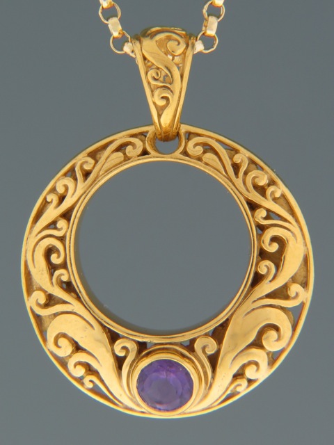 This Gold Vermeilpendant features a round faceted Amethyst stone.