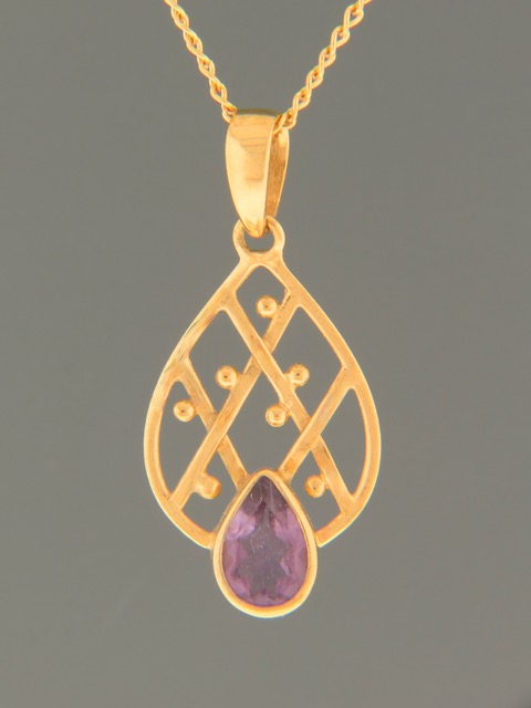 This Gold Vermeilpendant features a teardrop faceted Amethyst stone.