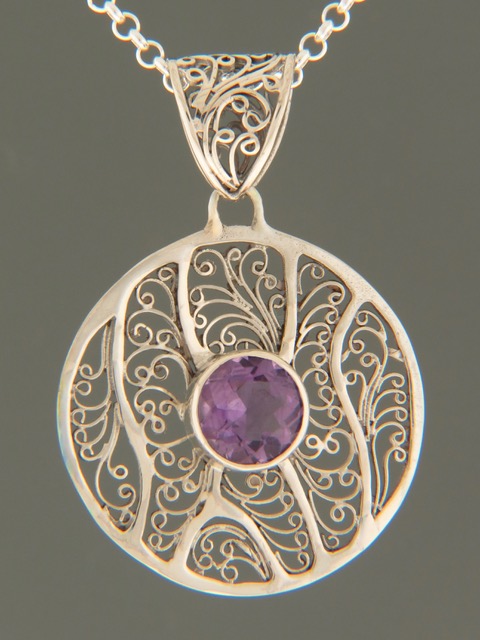 This filigreed Sterling Silver pendant features a round, faceted, Amethyst stone .