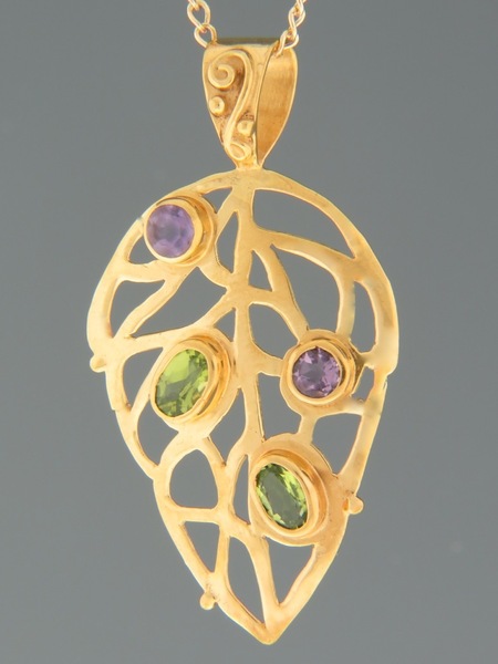 This Gold Vermeilpendant features round faceted Amethyst stones and oval faceted Peridot stones.