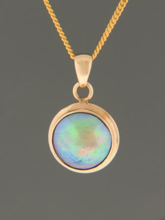 This 14ct Gold pendant features a New Zealand Blue Pearl grown in the local Paua shellfish showing green and blue colours with pink and gold highlights.