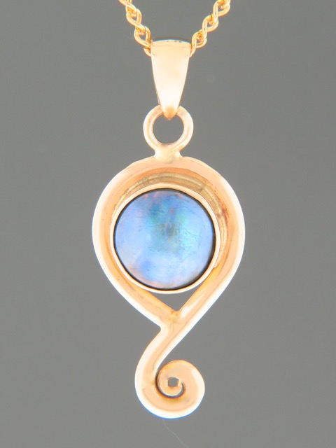 This 14ct Gold spiral design pendant features a New Zealand Blue Pearl grown in the local Paua shellfish showing vibrant blue, purple and green colours.