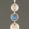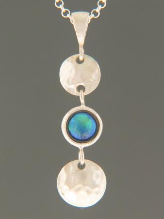 This Sterling Silver pendant features a lustrous New Zealand Blue Pearl grown in the local Paua shellfish showing vibrant blue, green and purple colours with two beaten Sterling Silver discs.