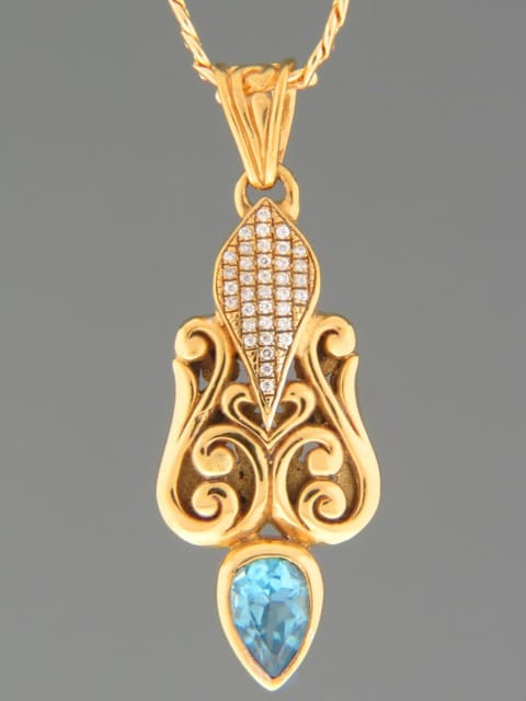 This Gold Vermeilpendant features a teardrop faceted Blue Topaz stone with round faceted Zircon accent stones.