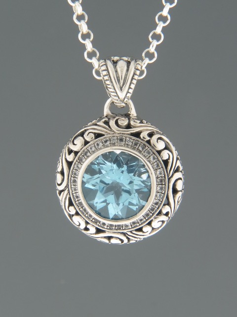 This Sterling Silver pendant features a round faceted Blue Topaz stone with round faceted Zircon accent stones.