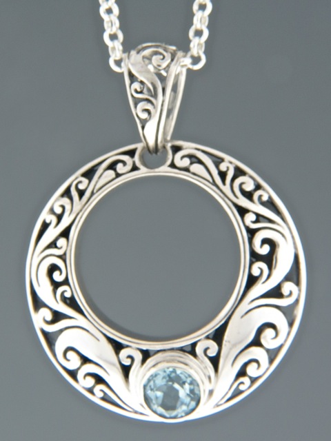 This Sterling Silver pendant features a round faceted Blue Topaz stone.