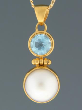 This Gold Vermeilpendant features a round, faceted Blue Topaz stone with a white Pacific blister Pearl.