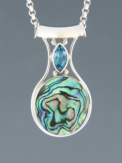 This Sterling Silver pendant features oval shaped New Zealand Paua Shell with a marquise faceted Blue Topaz stone.
