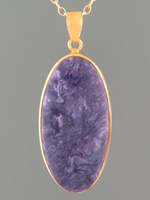 This Gold Vermeilpendant features an oval Charoite cabochon.