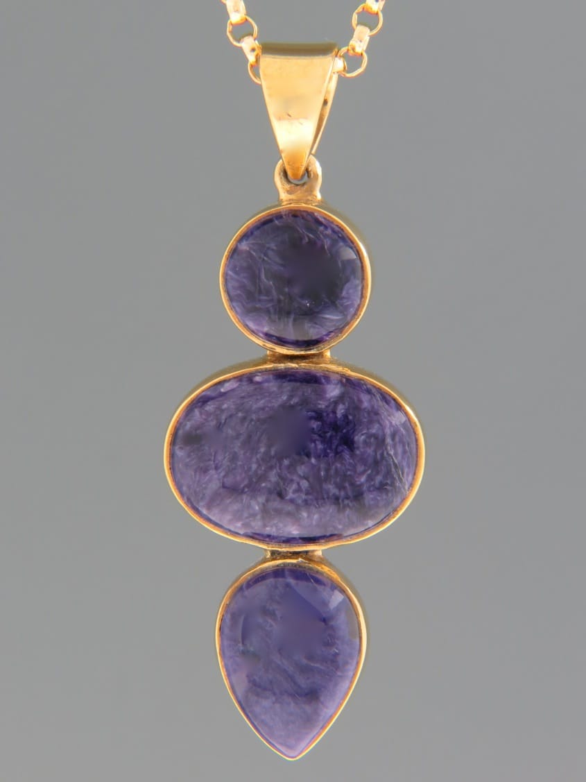 This Gold Vermeilpendant features round, oval and teardrop Charoite cabochons.